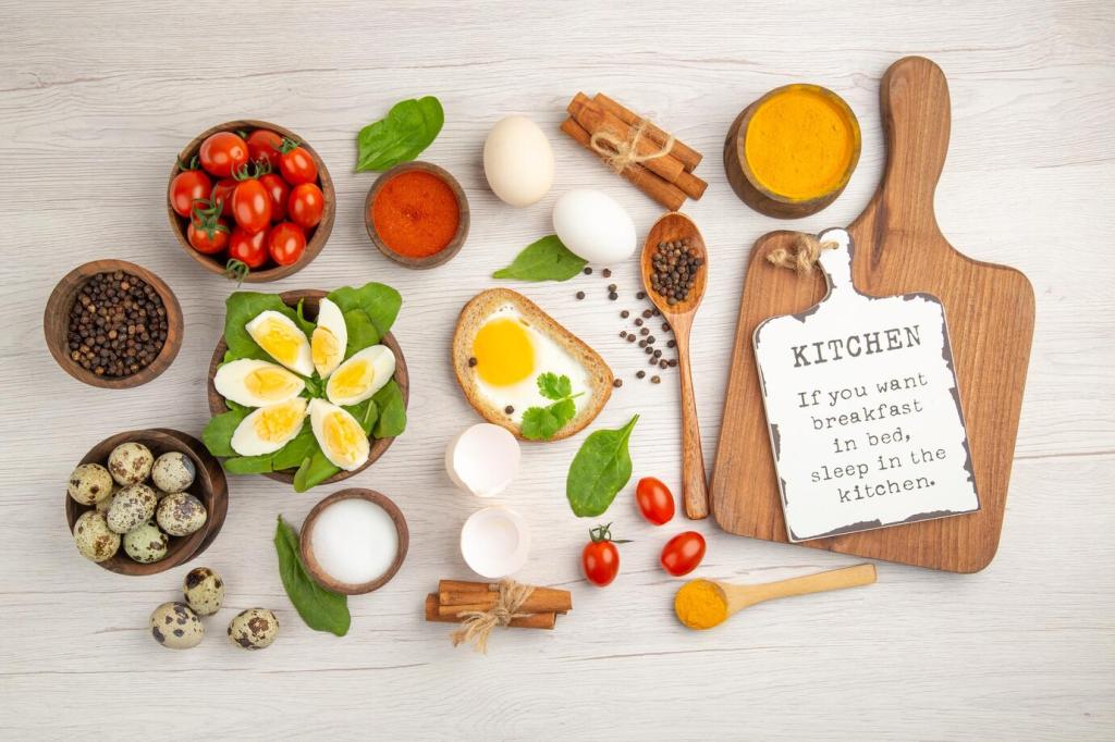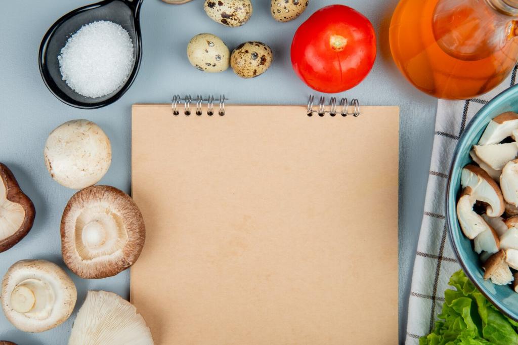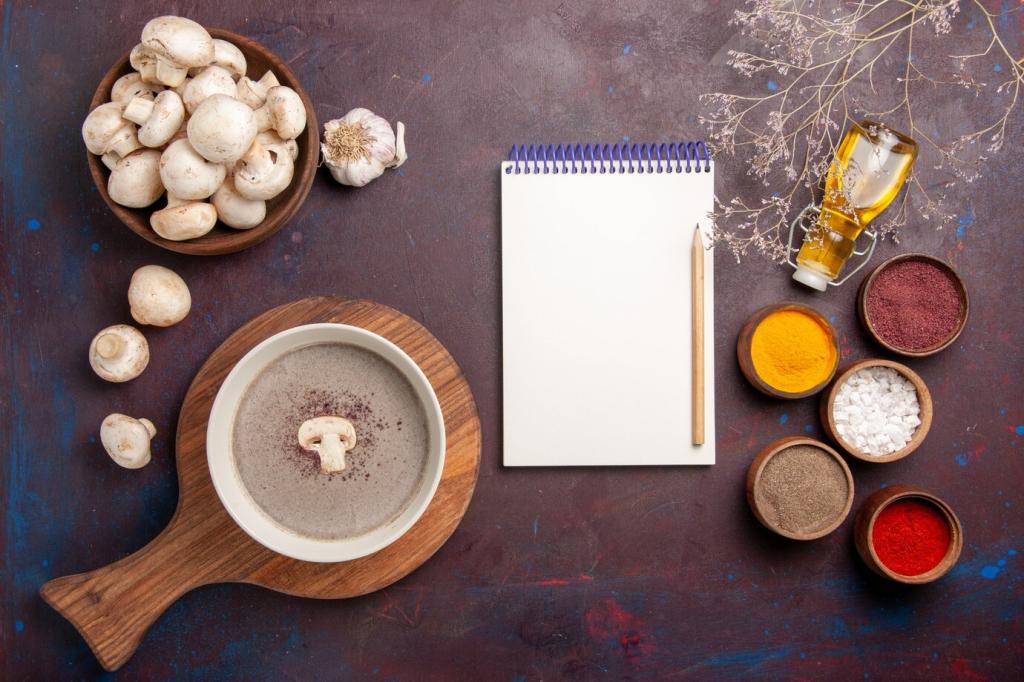 Schritt-für-Schritt-Anleitungen führen durch die Balance von Salz, Säure, Süße und Bitterkeit. Ergänze mit Temperatur und Textur: warm hebt Aromen, knusprig bringt Spannung. Notiere Veränderungen, damit du deinen persönlichen Geschmack gezielt entwickelst.